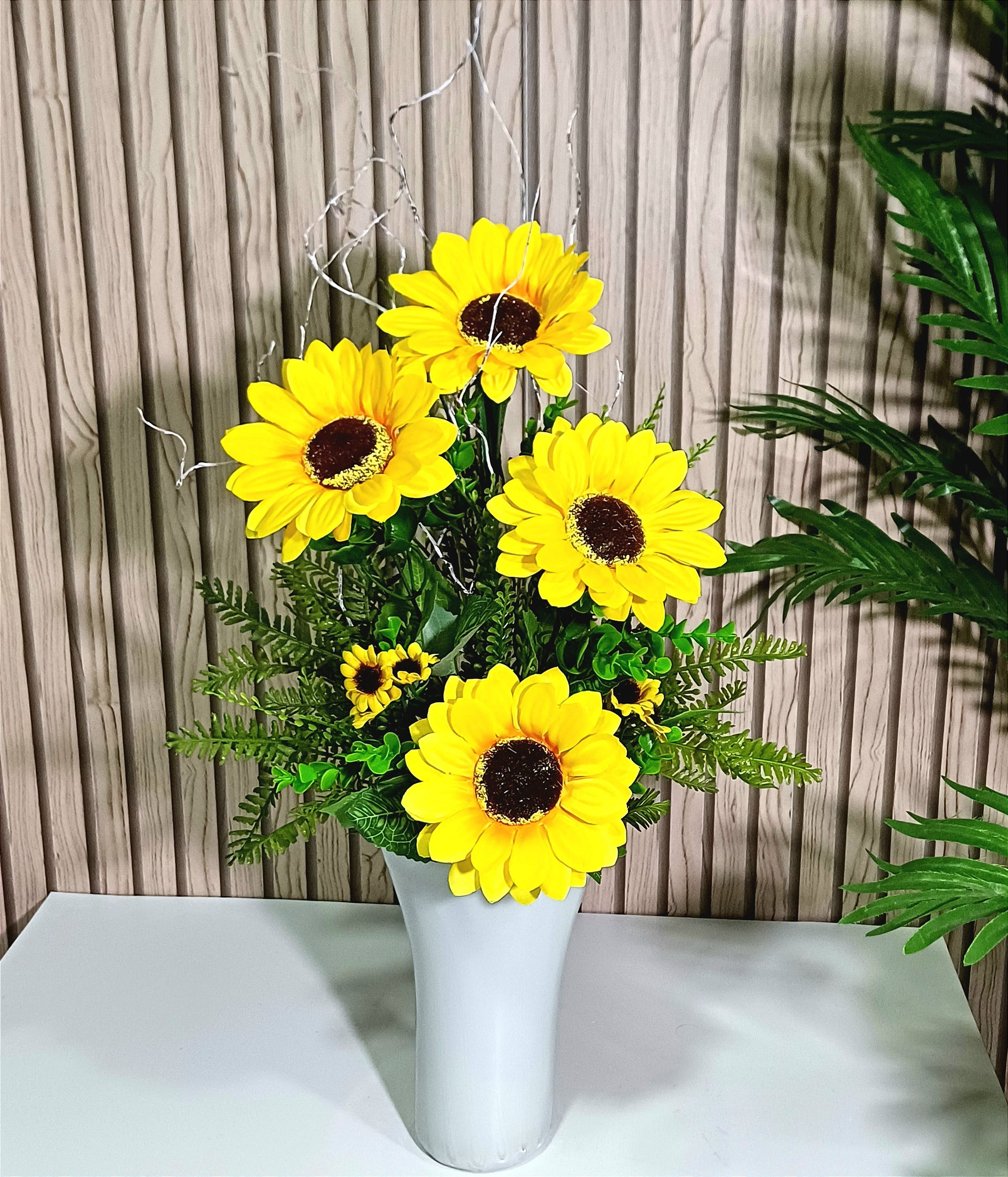 Ilumine e transforme qualquer ambiente com o deslumbrante Arranjo Cassia de Girassóis, uma peça que combina o brilho radiante dos girassóis com a elegância da taça de vidro branco, criando uma composição impactante e sofisticada.