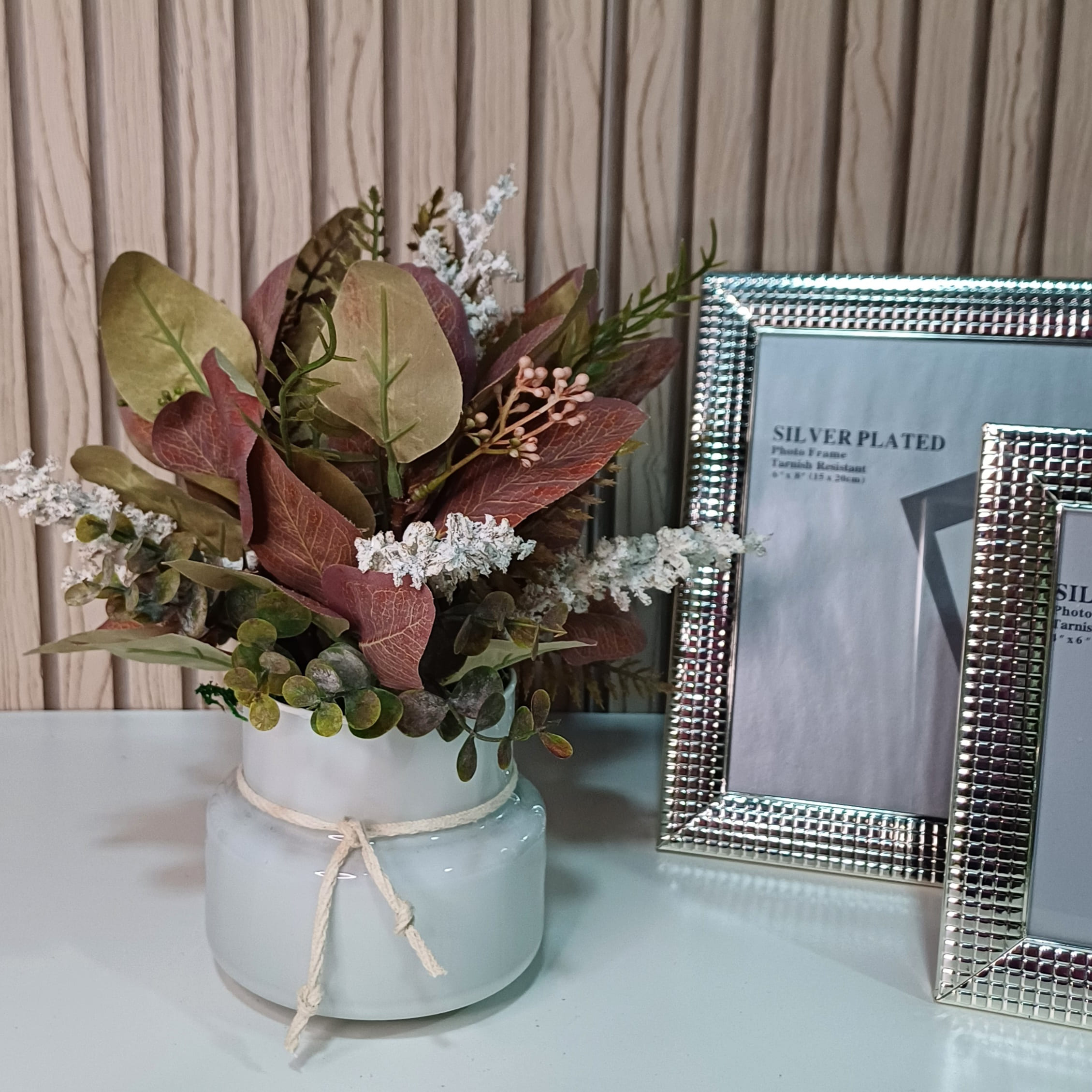 Adicione um toque suave e encantador à sua decoração com este arranjo de eucalipto rosa, montado em um vaso de vidro pintado de branco. Uma peça delicada que combina a suavidade das flores com a elegância do design minimalista.