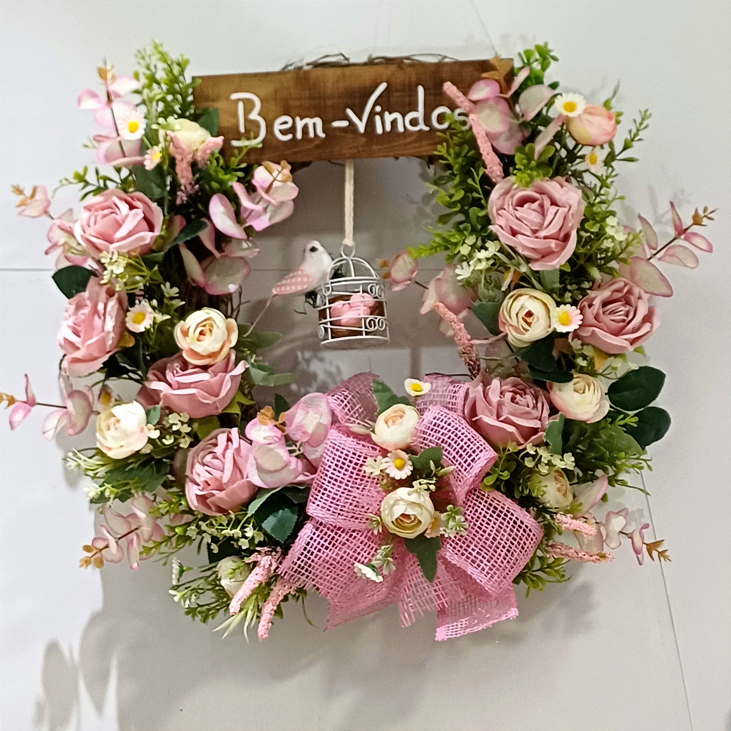 Encante sua porta com esta delicada guirlanda decorativa de rosas cor de rosa, perfeita para dar as boas-vindas com charme e elegância!