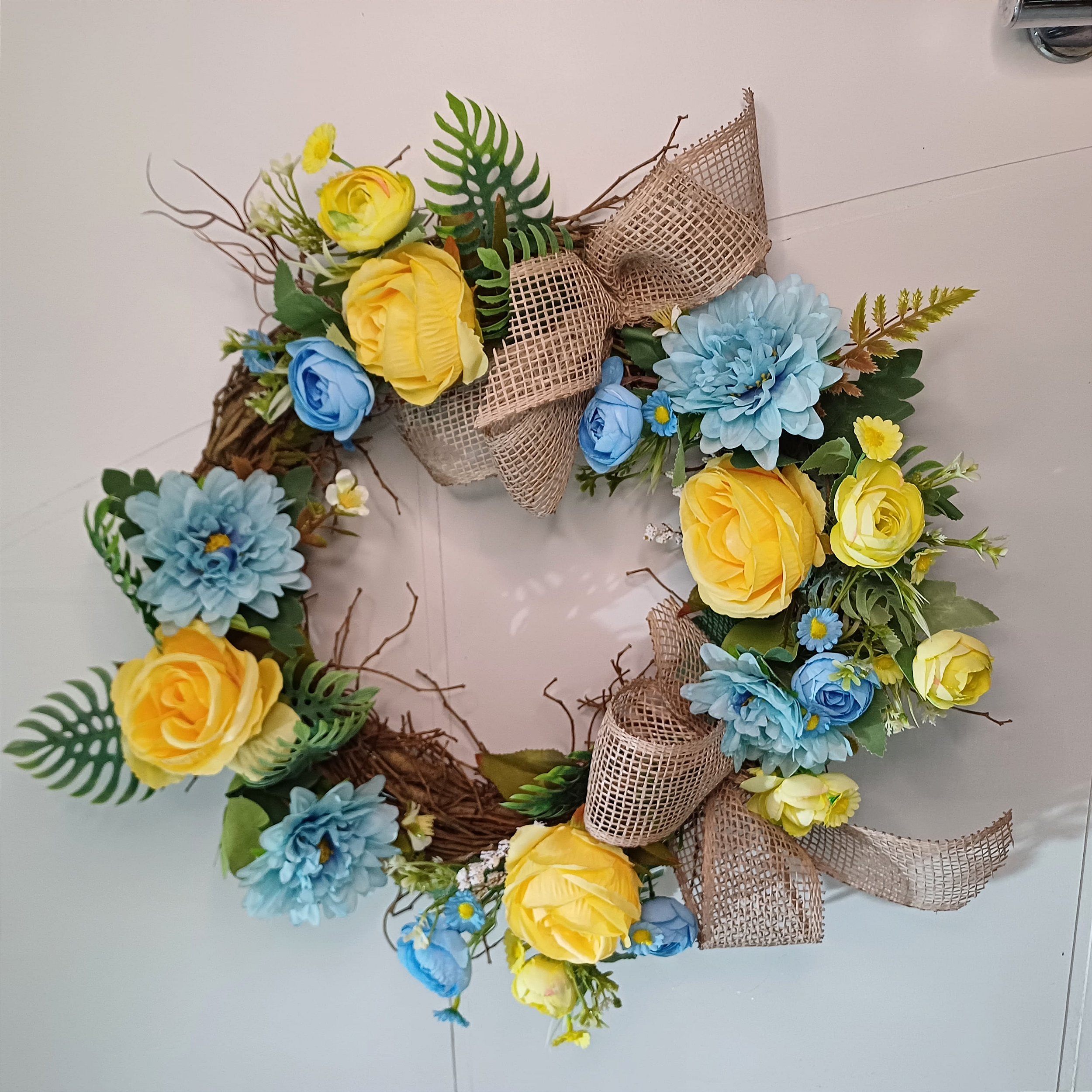 Essa guirlanda encantadora é montada em base de ficus e decorada com rosas, peônias e dálias artificiais em tons de azul e amarelo, além de uma delicada fita de juta que traz um toque rústico e sofisticado.