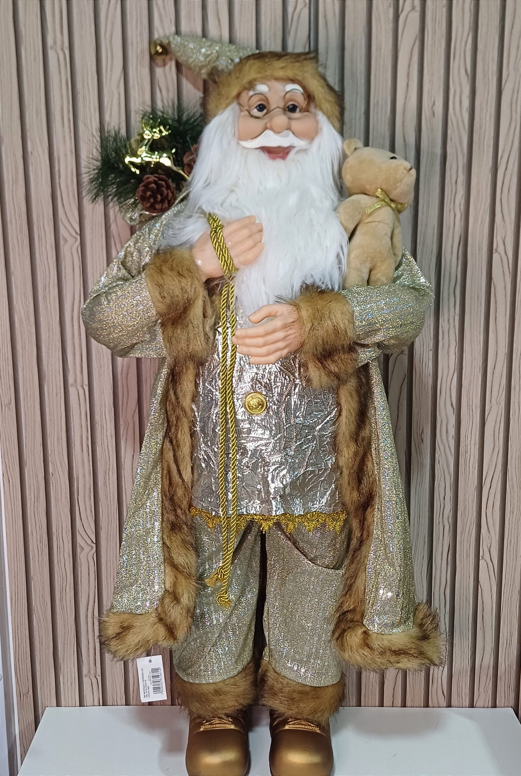 Encante sua decoração com este Papai Noel dourado de 90cm, imponente e sofisticado, ideal para criar um clima natalino cheio de elegância.